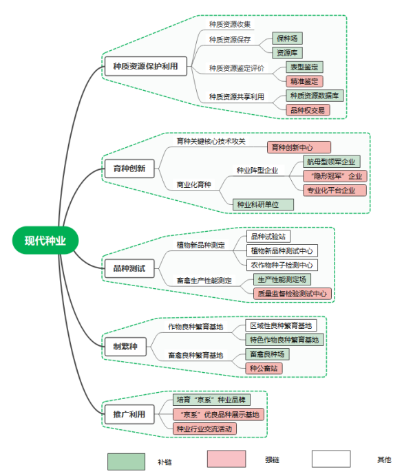 《规划》按照农业中关村建设“要着眼更高定位、锚定更远目标,立足北京、辐射全国、放眼世界,打造具有全国引领力和全球影响力的农业科技创新中心”的定位要求,系统谋划了平谷农业中关村产业链、创新链、空间链和政策链。具体以国家重大战略需求为引领,构建了以现代种业、设施农业、食品营养健康产业全链条为主线,以生物技术产业和智慧农业为支撑的产业生态链;围绕产业需求布局创新链,提出了各大产业的发展和建设重点;在空间上落实创新链,构建了“两翼·两轴·六组团”的空间结构,空间布局涵盖了科技研发、成果熟化转化、产业化应用全过程;配套政策链,从人、地、钱等要素保障和厚植创新生态等方面提出了支撑保障措施。另外,为指导《规划》落地实施,编写了相关政策汇编,谋划了重点工程项目,为农业中关村建设提供了有力抓手;梳理了国家种业阵型企业名单、相关领域头部企业和知名研究机构,编制了5大产业的目标招商企业和科研机构名录,为把准招商“坐标”、实现有目的地招商引智提供了支撑;同时,整理了江苏南京农高区、山西晋中农高区等典型案例,为规划实施提供了较好经验借鉴。
