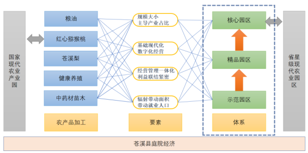 《规划》聚焦苍溪县红心猕猴桃、苍溪梨、粮油、健康养殖、中药材苗木5大主导产业,以全县庭院经济、园村融合发展特征为基础,从空间集聚、现代要素、运营组织、示范带动4个全新视角,构建了核心园区、精品园区、示范园区3大类宝塔型现代农业园区体系,通过模式创新、产业联动,层级推进苍溪县农业现代化、产业振兴和共同富裕。规划围绕苍溪县全国脱贫地区特色产业高质量发展引领区、全国乡村产业振兴样板区、四川省共同富裕示范区的发展定位,总结全县现代农业园区全产业链发展思路,探索提出了五大产业现代农业园区产业运营模式,着力固基础引技术、育主体拓产业、提质量增效益、转动能促高效、强组织优机制、聚要素引资源六大任务,谋划了81项重点项目,构建以农产品加工园区为统领的“一区、五带”苍溪县现代农业园区空间布局,可显著优化苍溪县产业布局和品种结构,必将为全面提升苍溪县农业综合经济效益提供有效支撑。