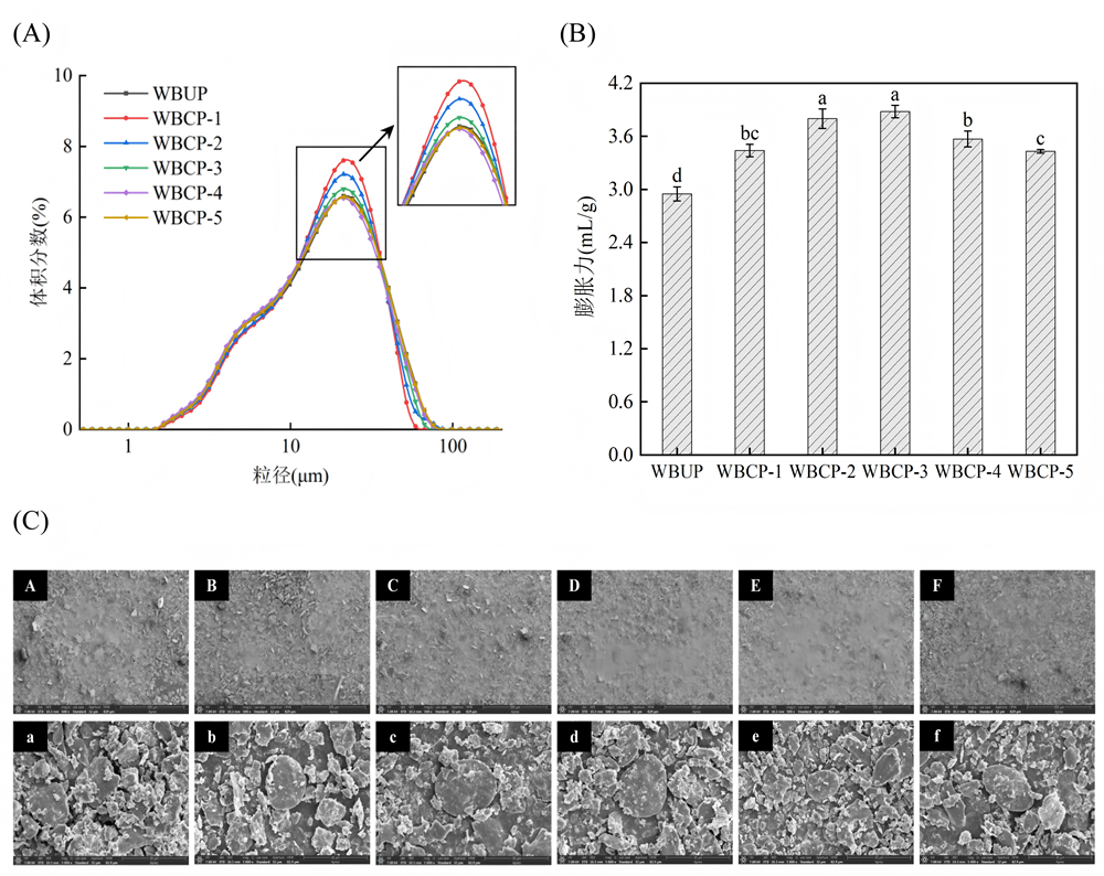 图1 超微粉碎协同麦谷蛋白改善麦麸超微粉粒径分布(图A)、膨胀力(图B)及微观形貌(图C)