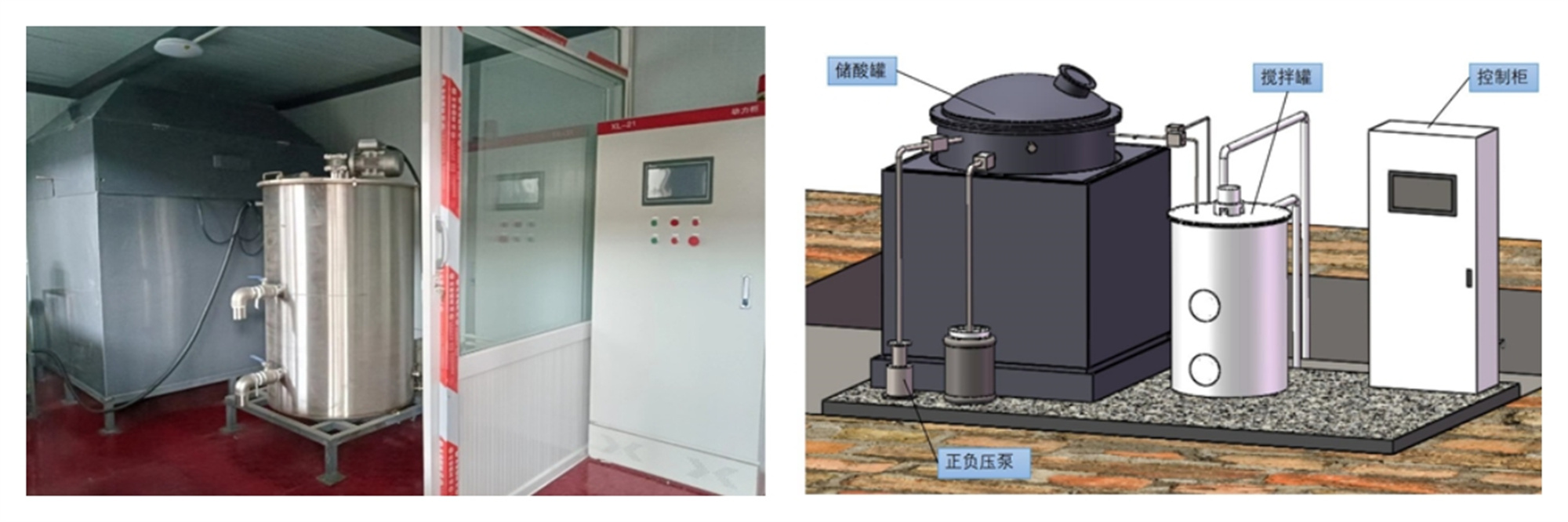 1. 开发了液体粪污酸化贮存发酵技术装备,解决了粪水酸化贮存工艺自动化控制难题。优选了适合工程应用的液体粪污酸化剂,根据养殖场设施用地情况、粪水酸化位置及方式等因素,研发了序批式粪水酸化贮存、涡流式粪水酸化、多段式管道连续粪水酸化等液体粪污酸化贮存技术装备及自控系统,经第三方检测和评价,粪水酸化pH误差为0.11,贮存60天可实现无害化,氨减排50%以上,养分含量提高60%以上。