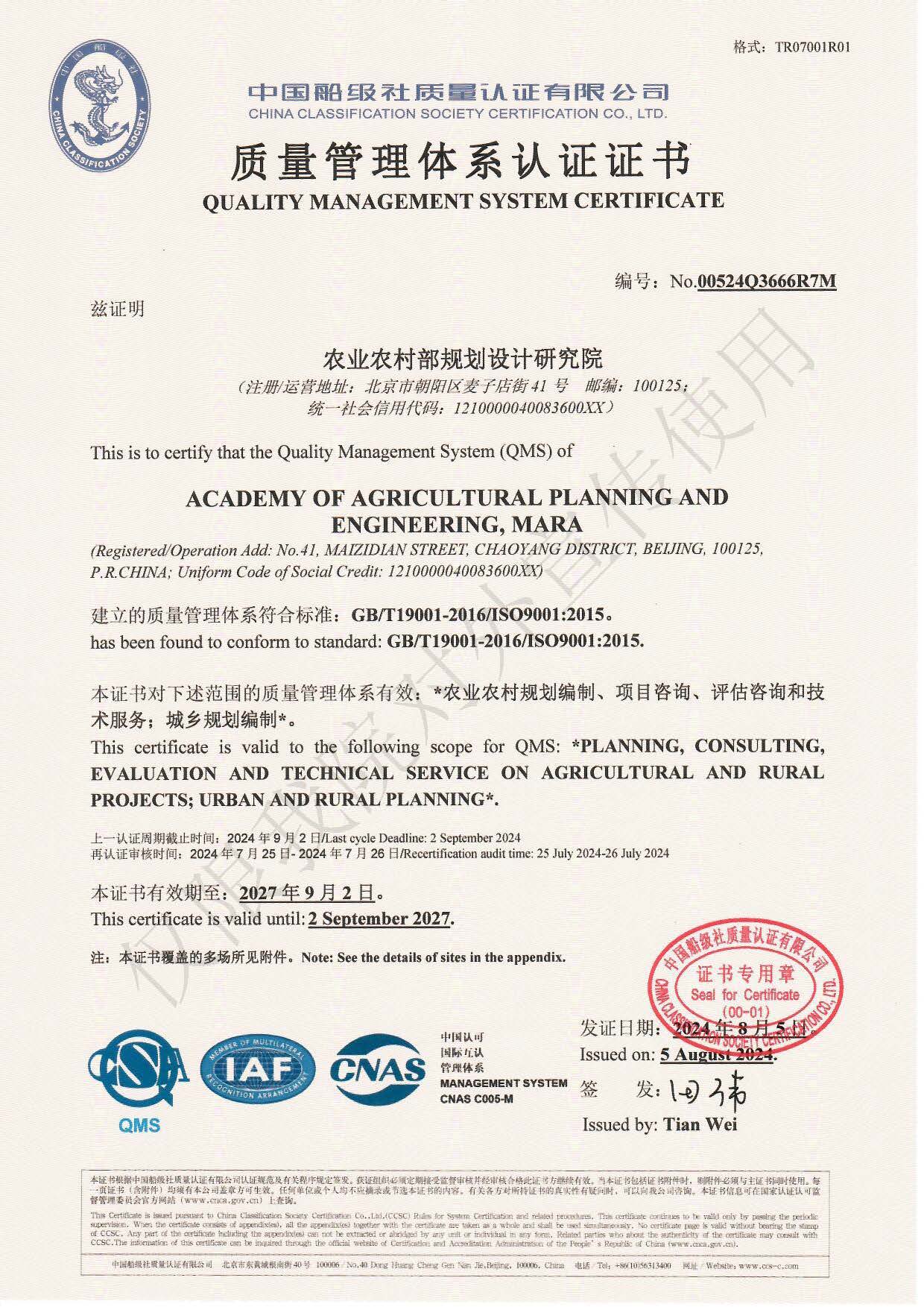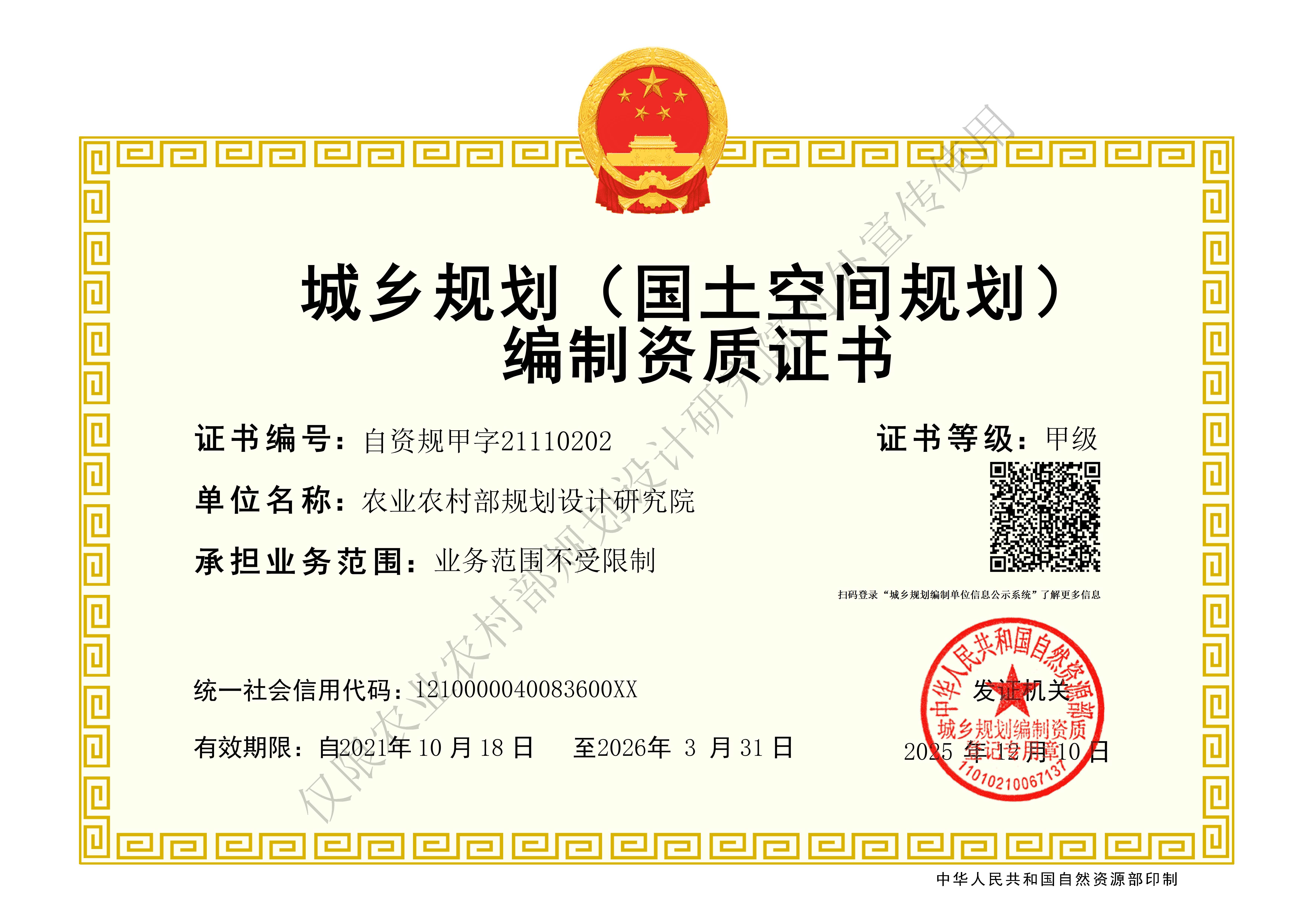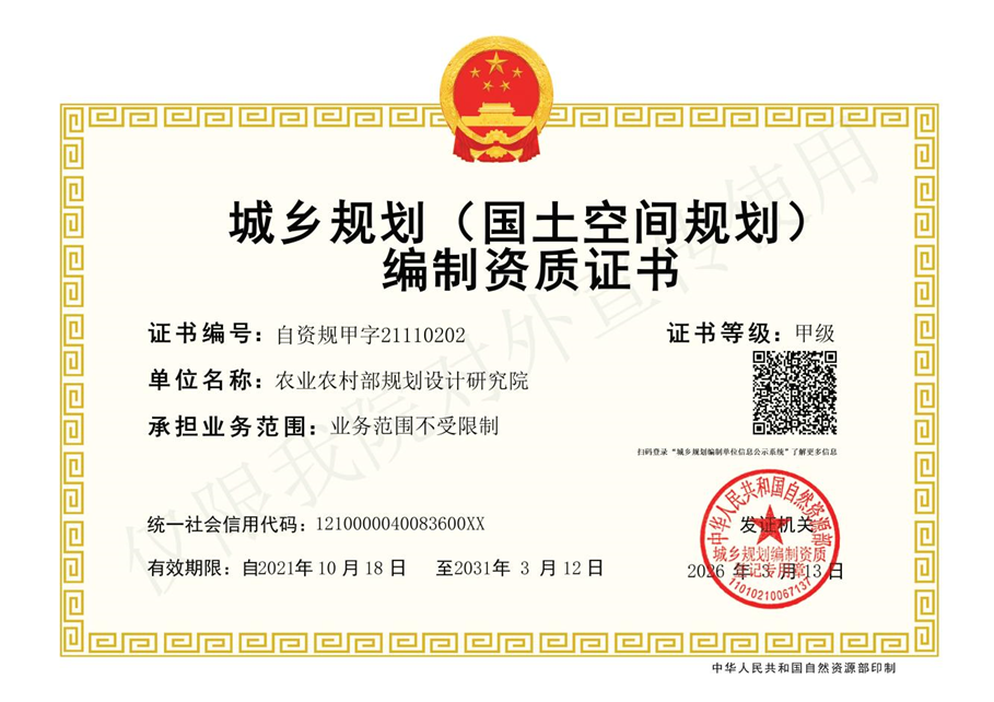 城乡规划编制甲级资质证书