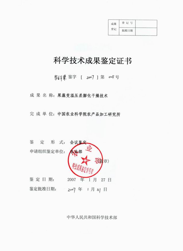 果蔬变温压差膨化干燥技术于2007年1月27日在北京通过了农业部组织的项目成果鉴定——农科果鉴字[2007]第008号,整体研究达到国际先进水平。现已申报国家发明专利6项,其中1项已经获得授权。授权专利:一种膨化桃及其制备方法(ZL200610165346.2);进入公开阶段的专利:一种膨化哈密瓜及其制备方法(200610165347.7);一种膨化菠萝及其制备方法(200610165348.1);一种膨化柑桔及其制备方法(200610165349.6);一种枸杞营养咀嚼片及其制备方法(200910082329.6) ;一种番茄营养咀嚼片及其制备方法(200910082328.1)。该技术自投入市场以来,引起了国内外科研单位和生产厂家的广泛关注。目前,已有数十个厂家在论证投产,中试技术和生产设备已经成熟,可以转让并投产。