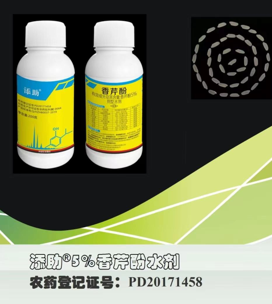 香芹酚是从牛至、百里香等多种芳香植物原料中提取的活性精油成分,具有多种生物学功能,包括杀菌、除虫、消毒、抗氧化、防腐等,对多种作物病虫害具有良好的防治作用,并且作为一种纯天然的植物源生物制剂,符合有机绿色生产标准。由农业农村部规划设计研究院在与华植河北生物科技有限公司组成的研发团队,对香芹酚防治柑橘木虱的作用机制及效果进行了系统研究,结果表明,香芹酚具有超强的酚羟基综合生物活性和极优异的脂溶性,能迅速密闭木虱气孔并能穿透细胞膜,失衡细胞内水分,还可渗入细胞内质膜、线粒体,抑制其呼吸,使细胞窒息而死亡(致死率 100%),同时具有熏毙及趋避木虱作用(致死率 80%),基本达到登记防治柑橘木虱的要求。基于以上研究,该团队在已登记防治柑橘红蜘蛛基础上,于 2021 年 3 月向农业农村部农药检定所提出登记柑橘木虱的申请,并于 2022 年 6 月获得 5%香芹酚水剂防治柑橘木虱的登记审批(农药登记证号:PD20171458)。为实现柑橘黄龙病绿色防控提供了有力的生物源农药产品市场支撑。