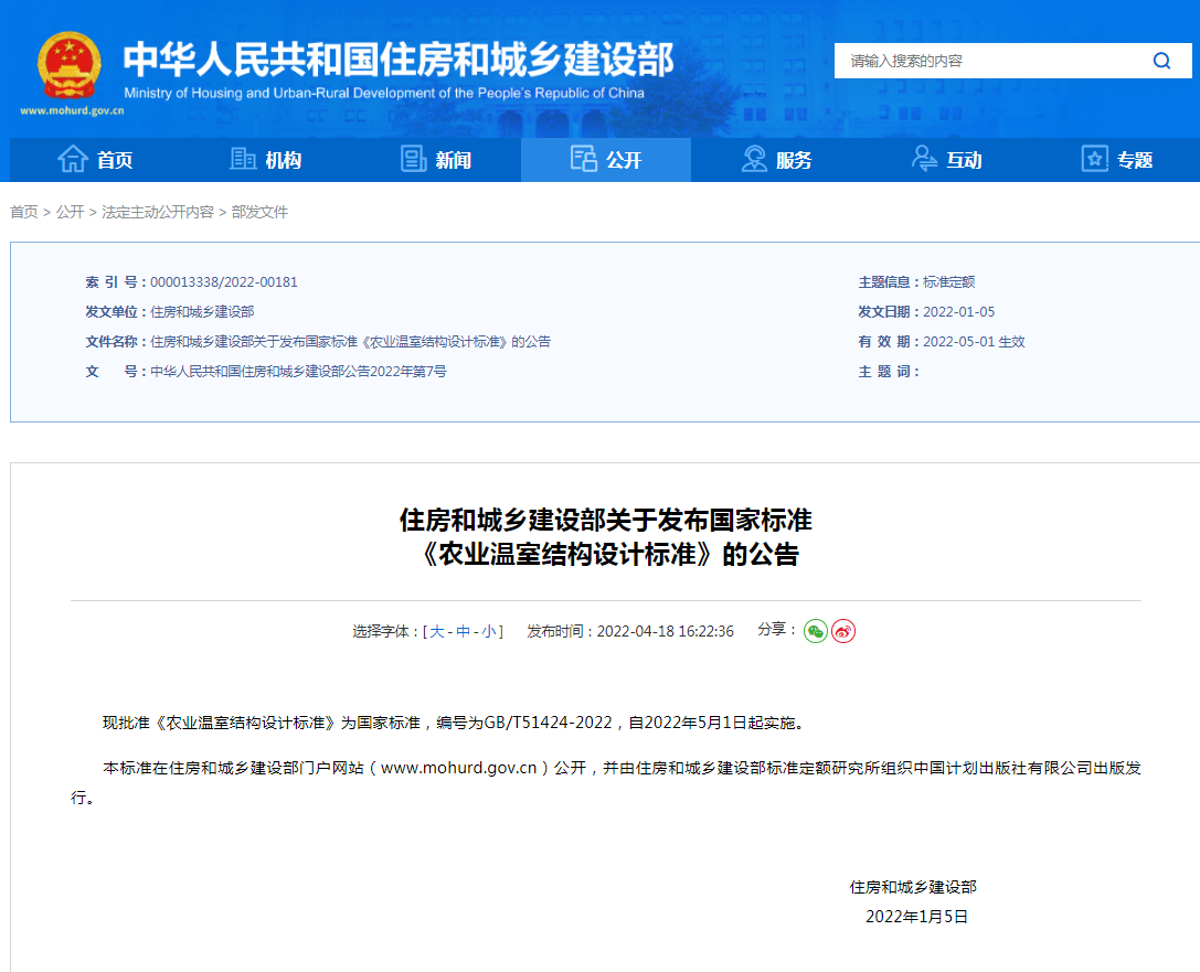 近日,住房和城乡建设部批准我院主持编制的《农业温室结构设计标准》为国家标准,编号为GB/T 51424-2022,自2022年5月1日起实施。