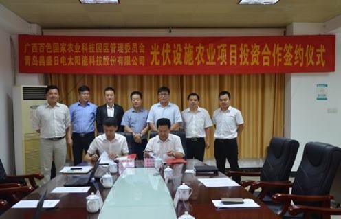 2016年5月31日广西百色国家农业科技园区管理委员会与青岛昌盛日电太阳能科技股份有限公司在百色农业科技园区隆重举行30MW光伏设施农业精准扶贫项目签约仪式,园区管委会常务副主任王晓、副主任魏晓明(院挂职干部)、青岛昌盛日电太阳能科技股份有限公司王钰总经理等20余人参加了签约仪式。