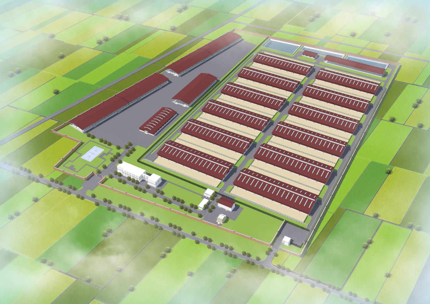 良种繁育示范培训中心主要建设挤奶厅(转盘式)、青年牛舍、干乳牛舍、特需牛舍、犊牛舍、育成牛舍、泌乳牛舍等生产建筑;青贮窖、干草棚、饲料加工间、机修间、垫料间等辅助生产建筑;综合办公楼、锅炉房、门卫、参观通道、消毒更衣间、挤奶通道等管理建筑;有机肥加工间、除臭间、固液分离间、调节池提升泵房及格栅池、集粪池、调节池等无害化处理设施。良种繁育示范培训中心存栏乳肉兼用型德系西门塔尔种牛3600头,总用地面积约381.7亩,总建筑面积约51320平方米。