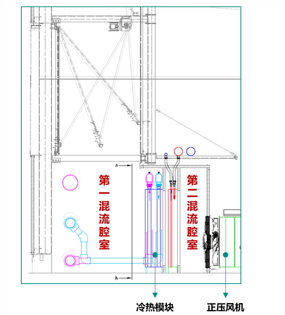 创新了降温减湿与送风协同调控的进风混流室结构,新型混流室结构可有效避免单模块故障引起的种植区局部温控失效。在单腔体的基础上,设置1个起到缓冲调节作用的第二腔室,对各个加热制冷模块处理后的空气进行混流,使送入种植区气体的温湿度具有一致性,不会因部分加热制冷模块发生故障导致温室内局部温湿度异常。CO2直接输入第二混流腔室,实现精准供给。