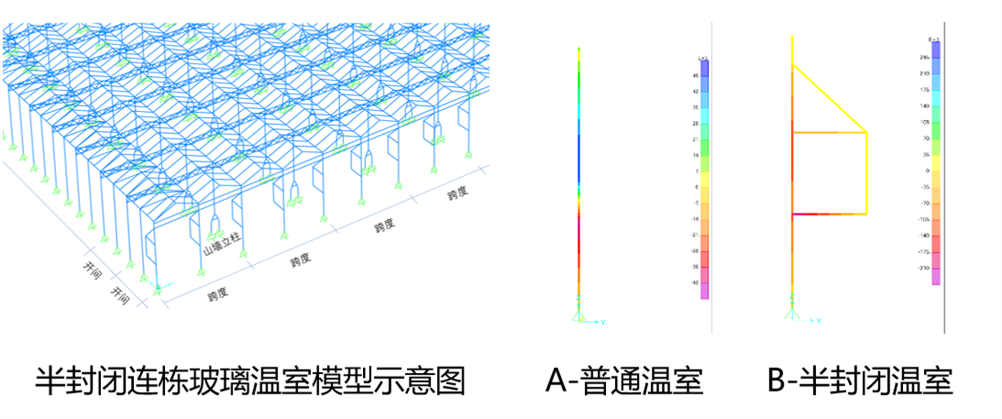 聚焦半封闭式连栋温室混流室结构精细化设计,系统分析了混流式山墙立柱的荷载情况(风、雪、覆盖系统、作物、拉幕系统、降温设备等),通过有限元分析对比发现:风荷载为主要控制荷载;考虑混流室位置的各类荷载后,对山墙立柱的内力及应力比影响较大,应力比显著增大。