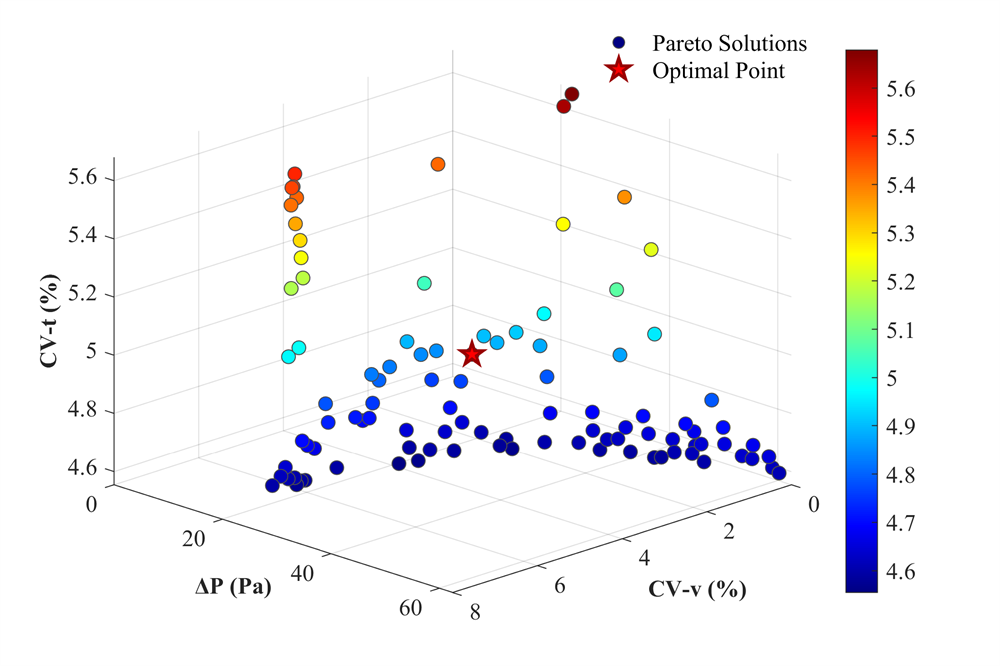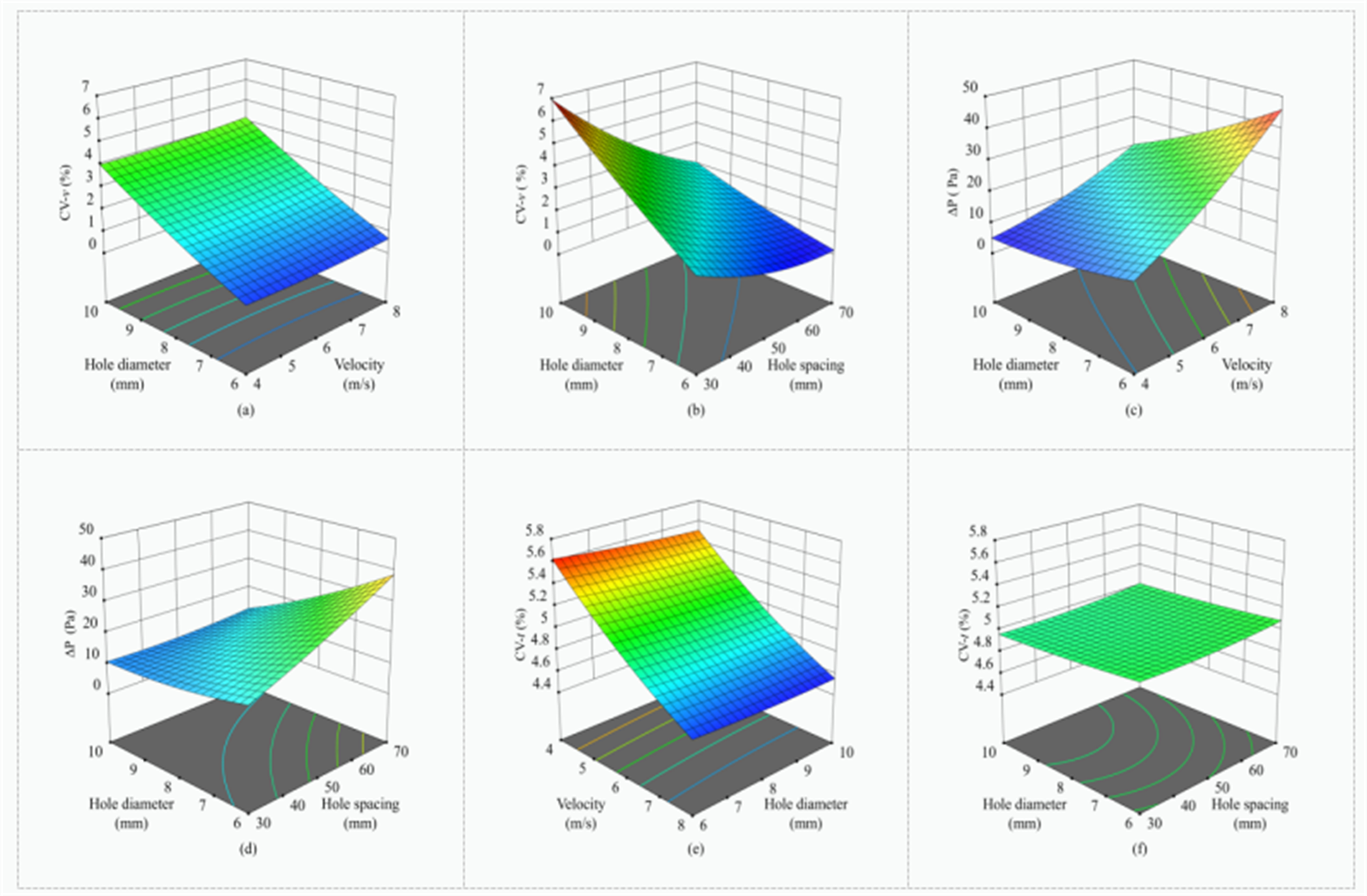 创新提出基于响应面模型与多目标优化的穿孔风管参数协同设计方法,揭示穿孔风管结构参数对气流特性的影响机制,构建了孔径、孔间距、入口风速与风速均匀性、压降及温度均匀性的预测模型。结果表明大孔径显著改善风速均匀性,而增大孔间距会降低均匀性;压力损失呈相反趋势;温度均匀性主要受入口风速影响。敏感性分析揭示孔径影响力最强,其次为孔间距和风速,且孔径与间距交互效应显著。结合熵权TOPSIS与NSGA-II优化,确定了“大孔径,宽间距”最优参数组合(孔径9.0mm、间距65mm、风速7.0m/s),该方案使风速变异系数(CV-v)降低58.8%、温度均匀性系数(CV-t)提升5.2%,压力损失(∆P)减少10.8%,能耗降低17.4%。