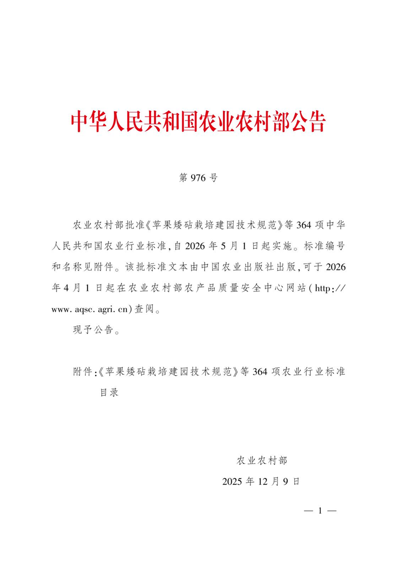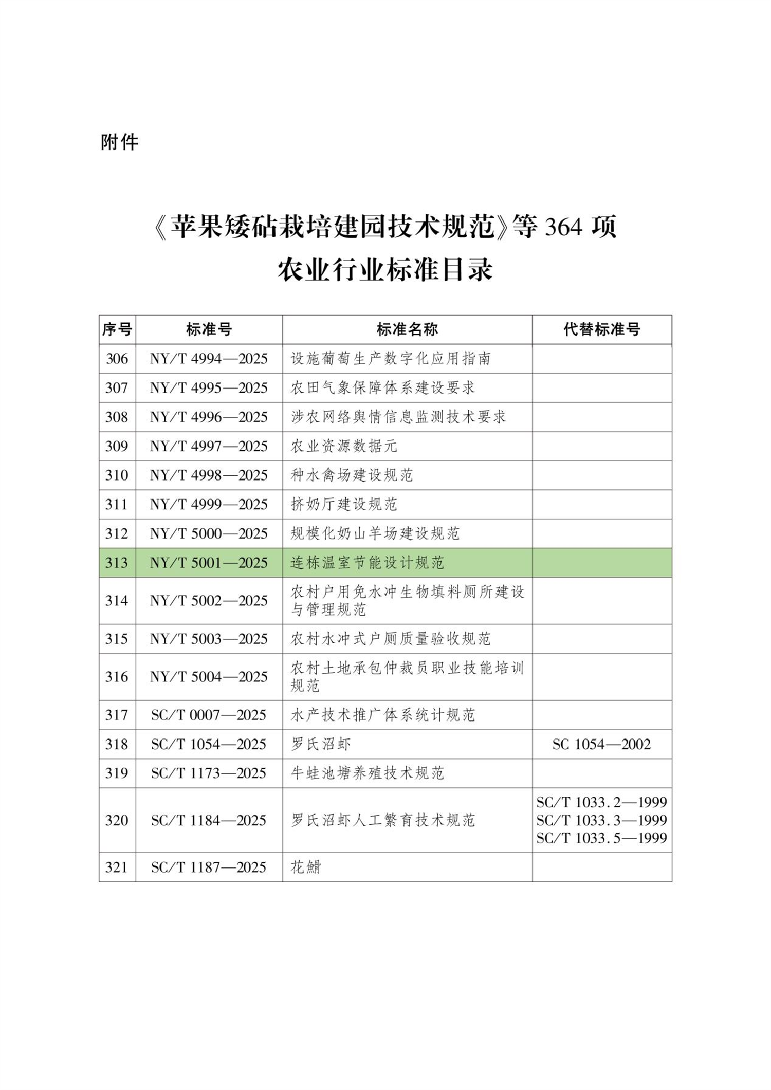 我院设施所主持编制的《连栋温室节能设计规范》,于2025年12月9日由农业农村部批准发布为中华人民共和国农业行业标准,标准号NY/T 5001-2025,自2026年5月1日起实施。
