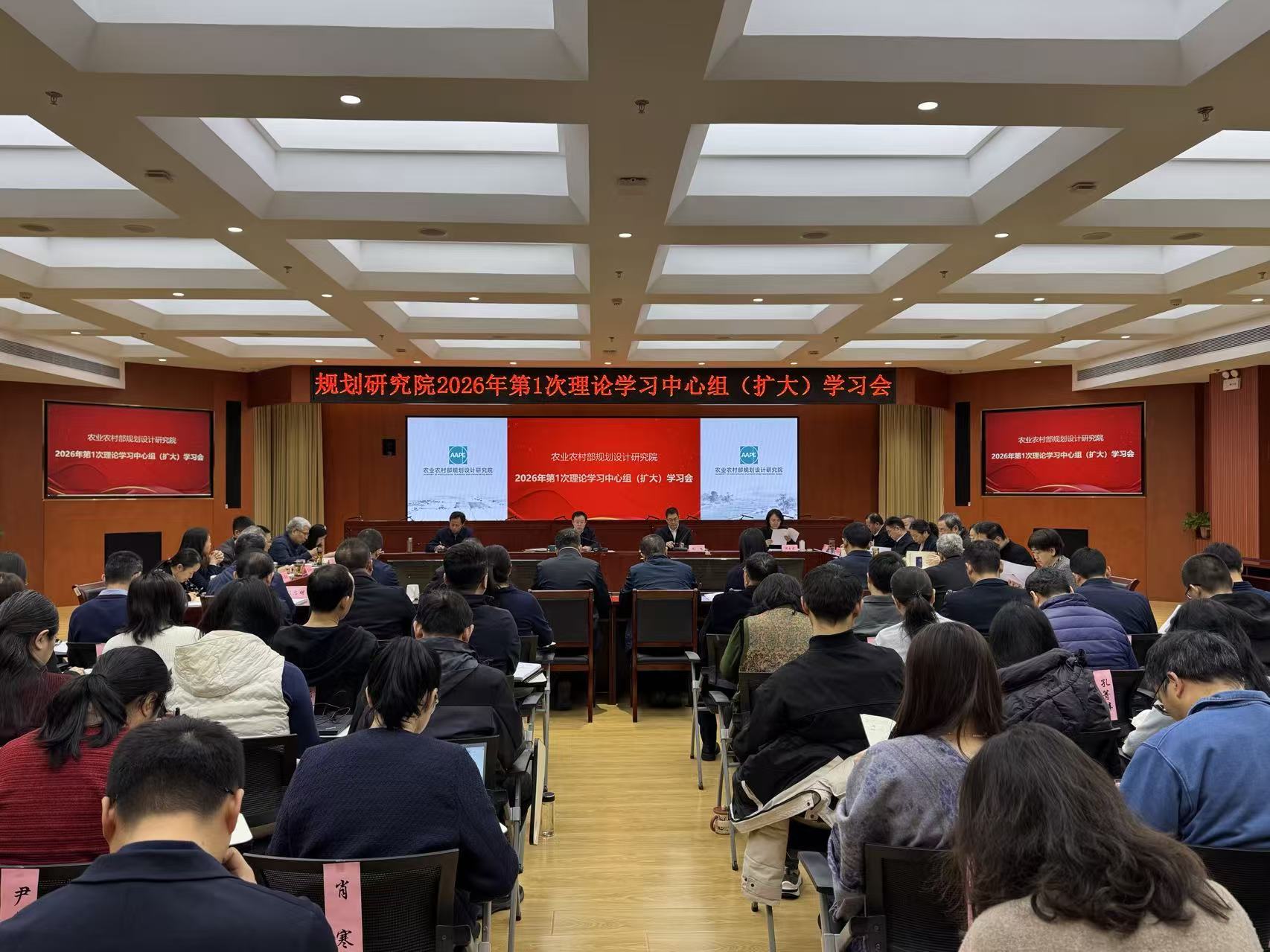 1月4-6日,我院召开2026年第1次理论学习中心组(扩大)学习会,采取个人自学、集中交流研讨等形式,深入学习贯彻中央经济工作会议、中央农村工作会议、全国农业农村厅局长会议精神。全院各部门结合年度工作,交流学习体会。院领导班子成员分别发言,院长、党委书记王衍主持会议并总结发言,中层干部、支部委员、企业及学会负责人、青年理论学习小组组长参加会议。